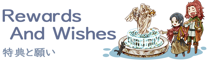 「願い」は、あなたが心の欲望をさらけだして、その願いをかなえるために私たちが奔走する特典システムです。簡単に説明すると、以下のリストから、あなたの願いの階級に応じて一つの願いを選ぶか、あるいは自由に願うことができます。自由に願いたい場合は、「カスタムウィッシュ」の項目をご参照ください。